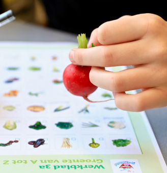 De bovenbouw speelt het kwartetspel. In dit spel leren de kinderen meer over seizoensgroente- en fruit, groente en fruit uit Nederland, voedselverspilling, duurzaamheid en keurmerken.