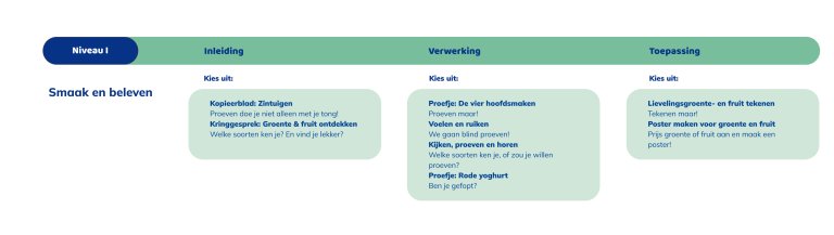 De lessen zijn er op twee niveaus: voor leerlingen met uitstroomprofiel dagbesteding (niveau I) en op uitstroomprofielen (beschut) werk en praktijkonderwijs (niveau II). Niveau I is eenvoudig en visueel, niveau II biedt meer verdieping. Jij kiest wat past bij jouw groep.