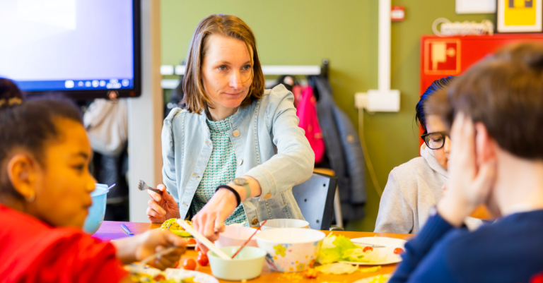 De hoeveelheid hulp die er tijdens de kookles is, bepaalt ook hoeveel leerlingen er gelijktijdig kunnen koken. We adviseren op de basisschool één volwassene per maximaal 8 leerlingen in de bovenbouw, bij de middenbouw 1 volwassene op maximaal 6 leerlingen en bij de onderbouw 1 op 5.